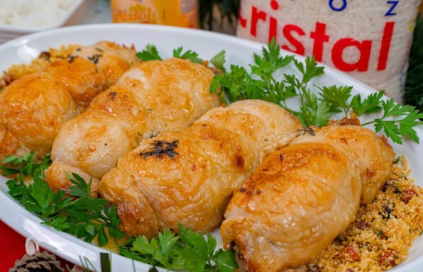 Uma receita prática, com sabor de comida feita em família, e que transforma o simples frango em um prato principal digno de ceia. É douradinha, suculenta e traz no recheio uma farofa cheia de textura: bacon, cenoura, temperos e aquele toque irresistível das festas.