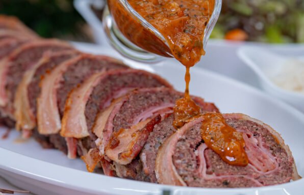 A carne fica bem temperada, recheada, envolvida no bacon e assada até ficar dourada e suculenta. O molho rústico de tomate prepara o cenário perfeito: simples, caseiro e cheio de sabor.