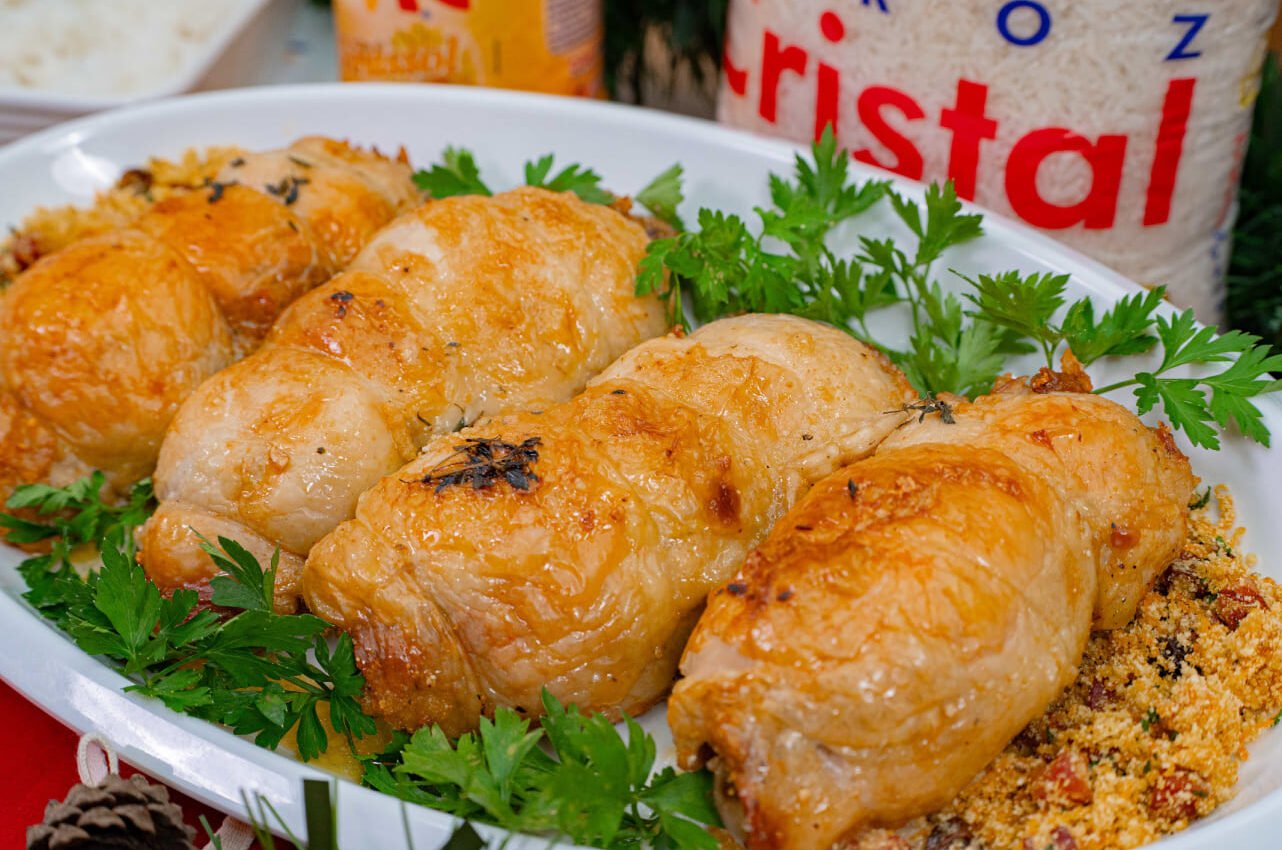 Uma receita prática, com sabor de comida feita em família, e que transforma o simples frango em um prato principal digno de ceia. É douradinha, suculenta e traz no recheio uma farofa cheia de textura: bacon, cenoura, temperos e aquele toque irresistível das festas.